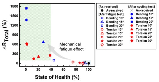 Figure 7 shows the relation between the SoH and ∆RTotal after the mechanical test under various conditions for the SoC 70% cell. The RTotal is the summation of RE, RA, and RC. The ∆RTotal indicates the increment of resistance after the fatigue and cyclic test as represented in Equation (1).