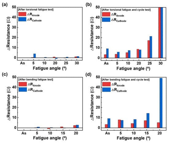 Anode and cathode resistance changes under different torsional and bending test degrees: (a) after the torsional fatigue test, (b) after the torsional fatigue and cycling test, (c) after the bending fatigue test, and (d) after the bending fatigue and cycling test.