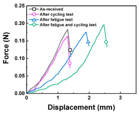 To compare the mechanical properties of the separators, a puncturing test was performed on the four separators [38]. Figure 10 shows the force–displacement curves of the separators obtained from the tested cells. After the cycling test (200 cycles) without any mechanical test, the result was similar to that of the pristine separator. This indicates that the electrochemical reactions of the electrodes did not affect the mechanical properties of the separators. However, the displacement under a fixed force increased after the fatigue test, revealing that the strength of the separator degraded. Moreover, the displacement value further increased after the fatigue and cycling tests. This indicates that the subsequent cycling of the batteries had an influence on the strength of the separators. This result can be attributed to the strain-softening phenomenon [39]. It is concluded that the mechanical fatigue test on the batteries before the cycling test can affect the separators in the cells after the cycling test.