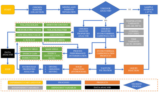 First, chicken manure was collected and prepared for hydrothermal carbonization. Parallelly, chicken manure was subjected to fuel properties determination analyses, namely proximate analyses (moisture content, volatile matter, fixed carbon, ash content) with calorific value determination (low and high heating value) and ultimate analyses (C, H, N, S, O). As a result of the HTC process, hydrochar mixed with a liquid fraction was produced at various process parameters (temperature, stirring rate, and process time). During the process, energy consumption for the process was measured. After the HTC process, HTC products were separated using vacuum filtration. Next, a solid fraction known as hydrochar was prepared (drying, grinding, sieving) for the same fuel analyses as chicken manure. Afterward, using data from the HTC process and after performing fuel properties analyses, HTC performance properties were determined (mass yield, energy densification ratio, energy yield, energy gain, and energy usage). Then, all data were analyzed and the best conditions for treatment of chicken manure in the HTC process were determined.