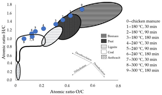 The Van Krevelen diagram (Figure 2) was used to present the fuel properties of derived HC by providing a comparison of the H/C and O/C ratios. Both values decreased as the process temperature increased. On the diagram, the positions of the HCs derived at lower parameters (as for time and temperature) were closer to the range of biomass and peat, while the HCs obtained at higher parameters were more similar to lignite and coal.