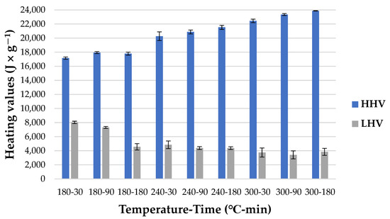 An HHV refers to the highest possible energy that is released through the full oxidation process of one fuel unit [59]. As can be seen in Figure 3, the HHV of HC increased with the increase in both temperature and time.