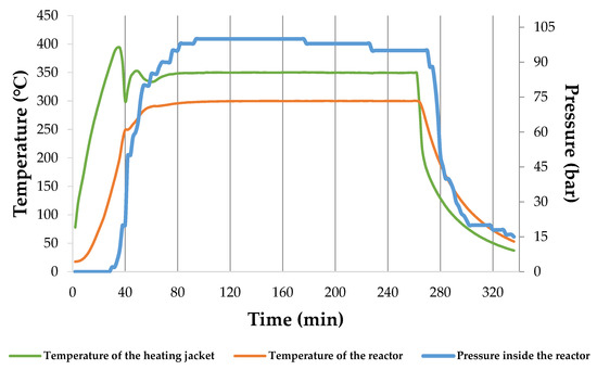 Temperature and pressure patterns during the process at 300 °C in 30 min.