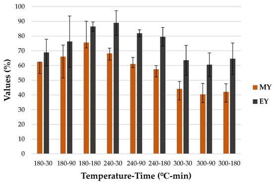 Energy yield is an important parameter, as it defines the amount of energy left in HC [49]. As presented in Figure 5, EY increased with time at 180 °C by 25.54%, and slightly at 300 °C by 1.62%. However, it decreased at 240 °C by 10.65%. Moreover, the HC obtained at 300 °C was characterized by the lowest EY, reaching 63.59 ± 10.13%, 60.57 ± 8.01% and 64.62 ± 10.71% in 30, 90, and 180 min, respectively. The highest EY was obtained from HC derived at 240 °C in 30 min (88.99 ± 8.29%) (Figure 5). A decrease in EY with increasing temperature was also noted for HC obtained from poultry litter, but also for biochar obtained from the same material [46]. The decreasing trend of EY for HC with increasing temperature and time is common because of material decomposition and its conversion into liquid and gas products as well [66]. The energy densification ratio shows the increase in the energy content of HC concerning the raw substrate. The EDr generally increased with time and temperature (p < 0.05) (Table A5) (Figure 6). The noticeable differences in standard deviation for different parameters are presented in Figure 5 and Figure 6 and might be particularly of interest for the 180-90 and 240-30 variants. This phenomenon is probably caused by the insufficient homogeneity of the samples used in the study. Chicken manure consists of droppings, bedding, and feathers. Those components are characterized by different properties. Therefore, it is possible that in some cases, prepared samples had more or less organic content than average. As result, samples with higher organic matter content showed higher decomposition and therefore lower MY and higher EY, EG, and EDr than those which had more ash content.