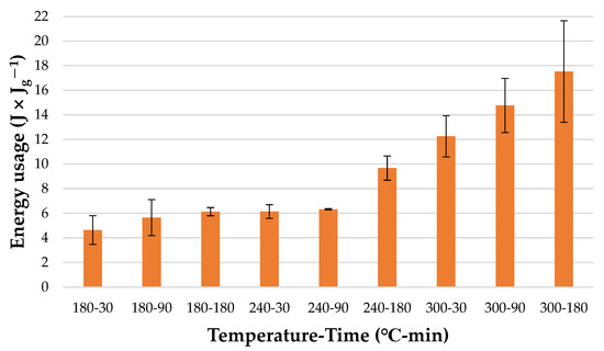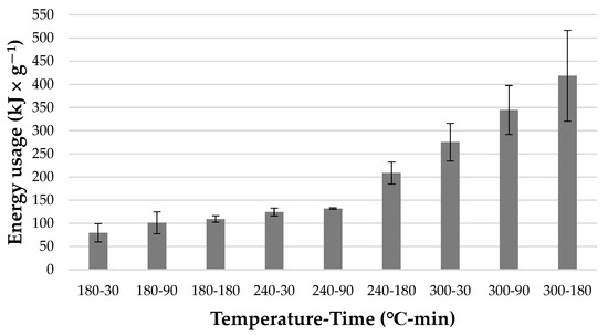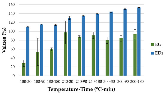 The highest value of EDr was obtained in HC produced at 300 °C in 180 min (153.56 ± 0.22). Generally, the EDr tends to increase with higher temperatures, which was proven for wheat straw, corn cob, sunflower stalk, and dry leaves [50,52]. Energy gain, which can determine the most favorable HTC conditions, shows the best compromise for mass and energy content in the derived HC. As shown in Figure 6, EG tends to increase with temperature and time. This correlation was also observed for the HTC process of eucalyptus-tree residues [37]. However, the highest EG was observed for HC obtained at 240 °C in 30 min, reaching 97.6 ± 25.78%. A statistically significant difference was observed between this HC and products obtained at 180 °C in 30 and 90 min (p < 0.05) (Table A6). This leads to the conclusion that HC derived at 240 °C in 30 min is more economically profitable, as it allows for the production of more energy with a slightly higher temperature and shorter time. What is more, as presented in Figure 7, energy usage (Eu) tends to increase with both temperature and retention time, reaching 418,270 ± 97,904 kJ × g−1 for HC obtained at 300 °C in 180 min, with a dry basis of the obtained HC.