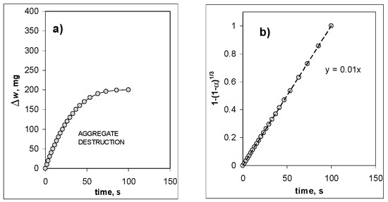 Figure 1. (a) Simulated aggregate destruction curve for k = 0.01 s−1 (td = 100 s) and Δw = 200 mg. (b) The destruction curve plot in coordinates of Equation (4) (slope = k).