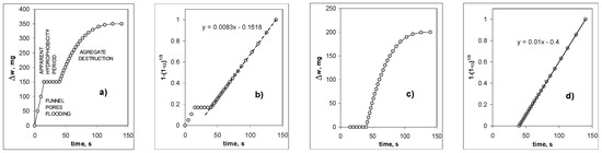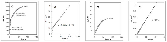 Subtracting FP from the aggregate destruction plus the funnel pores’ flooding curve, one obtains a new curve, describing the aggregate destruction process only, as it is depicted in Figure 2c. The slope of the latter curve plotted in coordinates of Equation (4) (Figure 2d) equals the slope in Figure 1b. Now, the correct destruction time is calculated.