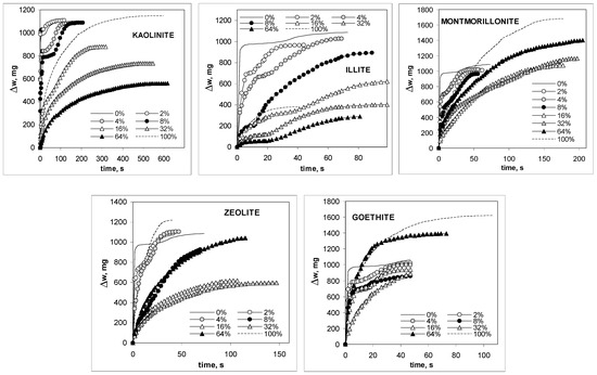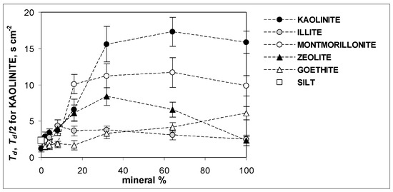 The bubbling curve of pure silt aggregate seems to be influenced by all three mechanisms occurring during fast wetting: initial fast flooding of funnel pores followed by the period of no bubbling, and finally, the aggregate destruction. Similar shapes of the curves occur for 2–8% concentrations of montmorillonite and zeolite, 2–16% concentrations of kaolinite and goethite and for 2–64% concentrations of illite. Some curves seem to be governed by the pure destruction process only (all 100% mineral aggregates, all 64% mineral aggregates excluding illite and 34% kaolinite and zeolite aggregates). The other curves reflect a coincidence of aggregate destruction and a shorter or longer period of funnel pores’ flooding. Individual approaches to each of the destruction curves, as described in Section 2 (eliminating funnel pores’ flooding, estimation of apparent hydrophobicity period, see Figure 1, Figure 2 and Figure 3), showed that within the detected aggregate destruction zone, the shrinking sphere model for water destruction of the studied aggregates (Equation (4)) was well-applicable. Taking td values calculated from the slopes of the linear fits of the destruction data plotted in coordinates of Equation (4) and dividing them by the initial surface of each aggregate, S0, the values of the time necessary to destroy the unit surface of the aggregate, Td = td/S0 (s m−2), were calculated. The results are presented in Figure 5.