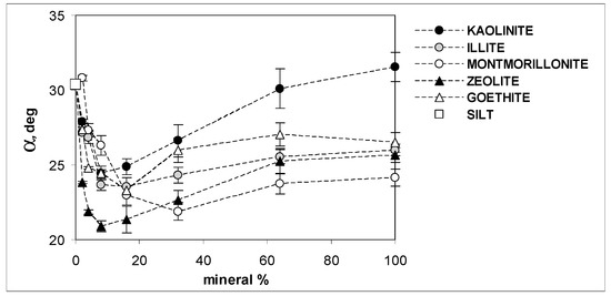 It was assumed that the first candidate to be responsible for the time of aggregate destruction is the contact angle: a higher contact angle would retard the water penetration more, and therefore, the aggregate destruction. The dependence of the contact angle on the minerals’ content is presented in Figure 6.