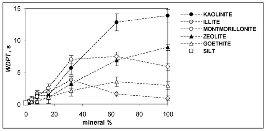 The dependence of the WDPT on the mineral content in the studied silt-mineral aggregates is shown in Figure 7.