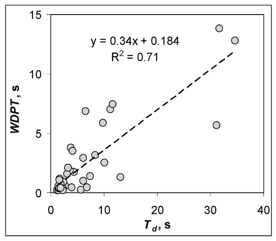For those who attribute WDPT to the wettability, the above correlation may indicate that more hydrophobic aggregates are more resistant to fast wetting. However, in the authors’ opinion, the WDPT has nothing to do with the wettability of hydrophilic beds and the above correlation indicates only that the porosity-dependent rate of water penetration into the material is a primary factor governing aggregate destruction.