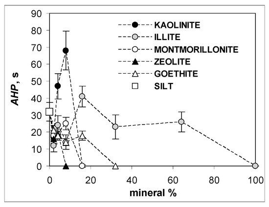 As it is shown in Figure 4, for some aggregates, after initial rapid bubbling, a period of no bubbling occurs. This apparent hydrophobicity period (AHP (s)) depends on the type of mineral used and its concentration: except for illite aggregates, it occurs mainly at low mineral contents. The time-length of AHP is presented in Figure 9.