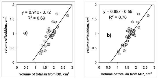 Figure 10. Relations of the total volume of bubbles and total volume of air present in the aggregates: (a) calculated from bulk density and (b) measured by mercury intrusion porosimetry.