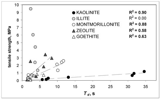 Figure 11. Correlations between time necessary for complete destruction of the unit aggregate surface (Td) and tensile strength. R2 are linear regression coefficients.