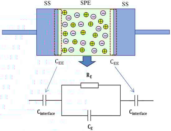 Here, ni is the density of charge carriers with the ion mobility denoted by µi, and 1.6 × 10−19 C is the value of q. Variables such as ionic conducting charge species concentration, temperature, and carrier mobility can all affect ionic DC conductivity [62]. Thus, substantial growth in DC conductivity for the sample with 30 wt.% of KSCNis correlated to the increase in charge carrier concentration as a consequence of salt involvement at room temperature [37,47,63]. For more clarification, an EEC diagram for impedance plots, which indicates a high-frequency semicircle and a low-frequency spike as a schematic representation, is shown in Figure 3.