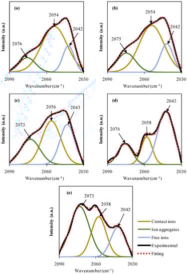 This technique is also effective for measuring the dissociation of ions [70]. Thiocyanate anion (SCN-) has two possible reactive sites and regarded as a linear molecular ion. This ion can form bridge complexes between N and S atoms in addition to S-bonding (CS stretching) and N-bonding (CN stretching). It has been suggested by Woo et al. that the wavelengths at which the bands appear correspond to free ions at 2040 cm−1, pair contact ions at 2058 cm−1, and ions aggregates at 2074 cm−1 [71]. Equation (19) is used to determine the percentage of ions [63]. Ion association and dissociation were distinguished by deconvoluting the overlapped complex spectra between 2030 and 2090 cm−1.