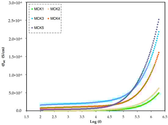To realize the ion dynamics in polymer electrolytes, the frequency dependence of AC conductivity at room temperatures was examined for all samples, which can be seen in Figure 11. According to documents recorded in the literature [95] conductivity in polymer electrolytes progresses via two main mechanisms. The first mechanism is in action by ion charge migration across coordinated sites in the host polymer and results in DC contribution. The second one is in progress after increasing conductivity as a result of polymer segmental motion and polarization and results in AC dispersion. Equation (23) is applied to gain the AC conductivities: