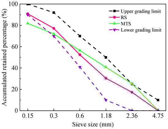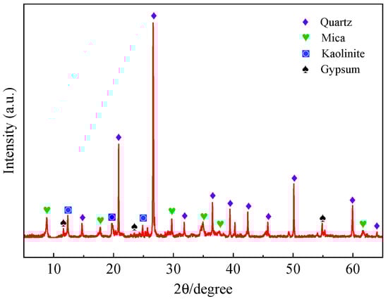 The cement used in this study was P·O 42.5 ordinary Portland cement. The main properties and chemical compositions of cement are shown in Table 1 and Table 2, respectively. River sand (RS) was purchased from a sand plant in Changsha, Hunan province. The relevant physical properties are shown in Table 3, and the gradation curve is shown in Figure 1. Manganese tailing sand (MTS) was produced by drying, crushing and screening manganese stone. The specific preparation process is shown in Figure 2. The chemical compositions and physical properties are shown in Table 2 and Table 3, and the gradation curve is shown in Figure 1. The XRD pattern of MTS (Figure 3) indicates that the main mineral of MTS is quartz, and it also contains mica, kaolinite and a small amount of gypsum. Coarse aggregate (CA) was continuously graded gravel with a diameter of 5~10 mm. The apparent density of CA is 2750 kg/m3, water absorption is 0.68%, and mud content is less than 1%. The concrete mixing water was domestic water.