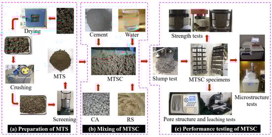 Test process diagram. (a) Preparation of MTS, (b) Mixing of MTSC, (c) Performance testing of MTSC.