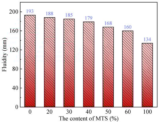 The effect of MTS content on MTSC fluidity is shown in Figure 4. It can be seen that with the increase in MTS content, the fluidity of MTSC continues to decline. Without MTS, the fluidity of concrete is 193 mm; the content of MTS is 100%, the fluidity of concrete decreases to 134 mm and the decrease rate is 30.6%. The content of MTS has a great influence on the fluidity of MTSC. The main reason is that, on the one hand, MTS has more fine powder content and requires more water; on the other hand, MTS may produce tiny cracks when it is crushed, which leads to a greater water absorption rate of MTS than RS; thus, the fluidity of MTSC decreases with the increase in MTS content. It is worth noting that when the content of MTS is less than 40%, the fluidity of MTSC decreases by less than 7.4%, and the fluidity of MTSC basically meets the construction requirements.