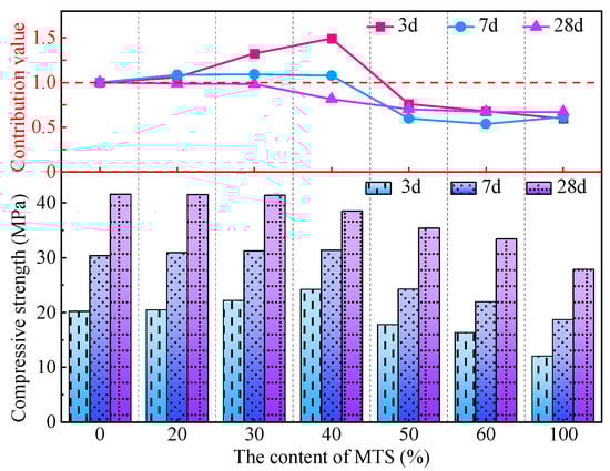 The influence of MTS content on the compressive strength of MTSC and its strong contribution value is shown in Figure 6. With the increase in MTS content, the compressive strength of MTSC at different ages presents inconsistent regularity. The compressive strength of MTSC at 3 d and 7 d increases first and then decreases with the increase in MTS content. However, the compressive strength at 28d decreases gradually with the increase in MTS content. Specifically, when the age is 3 d and 7 d, the compressive strength of MTSC with 40% MTS content reaches its maximum value, which is 24.2 MPa and 31.3 MPa, respectively. When the age is 28 d, the compressive strength of concrete without MTS is the highest, which is 41.6 MPa. The results indicate that MTS with certain content (content ≤ 40%) can improve the early compressive strength of concrete, but there is no obvious advantage in the later compressive strength development. Too much (content > 40%) of MTS has no contribution to the compressive strength of concrete. The compressive strength of MTSC with an MTS content of 100% is much lower than that of concrete without or with a small amount of MTS. The main reason is that part of gypsum is contained in MTS. Gypsum can react with C3A in cement to form ettringite and fill micropores, making the concrete structure dense and conducive to the development of early compressive strength. However, due to excessive gypsum, a lot of ettringite in MTSC forms expansion stress, leading to the decline of compressive strength. Another reason is that the increase in MTS content leads to an increase in fine powder content and a higher crushing index of the sand. The last reason is that the increased particle crushing index of MTS forms a weak microaggregate effect compared to RS. It is worth noting that the 28 d compressive strength of MTSC with 20% and 30% MTS is 41.5 MPa and 41.4 MPa, and the decrease rate is only 0.24% and 0.48%. In addition, the growth rate of the compressive strength of MTSC is obviously faster in the early stages than in the middle and late stages, which is consistent with the growth law of the compressive strength of ordinary concrete [26,27]. This indicates that RS can be replaced by MTS to prepare concrete, but the replacement rate should be less than 40%. Otherwise, it can lead to a substantial decline in the strength of concrete.