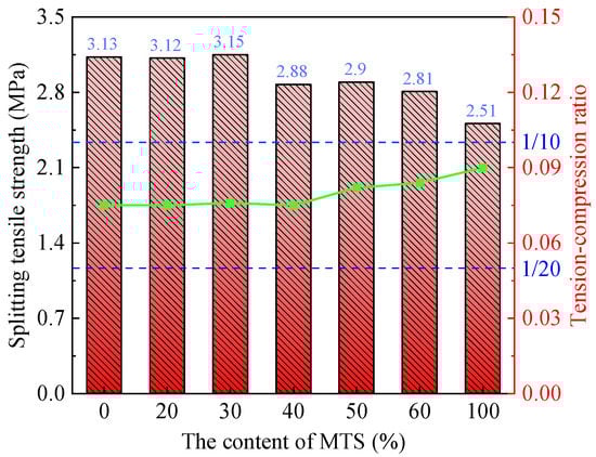 Figure 7 shows the influence of MTS content on the 28d splitting tensile strength and the tension–compression ratio of MTSC. As can be seen from Figure 7, when the content of MTS is less than 30%, the splitting tensile strength of MTSC remains unchanged basically. However, when the content of MTS is more than 30%, the splitting tensile strength of MTSC decreases gradually with the increase in MTS. Moreover, the ratio of splitting tensile strength to compressive strength of MTSC remains between 1/10 and 1/20, which is consistent with the law of ordinary concrete [28,29]. In conclusion, the addition of an appropriate amount of MTS cannot degrade the splitting tensile strength of concrete and may even slightly improve it. Additionally, the addition of excessive MTS leads to a significant decrease in the splitting tensile strength of concrete.