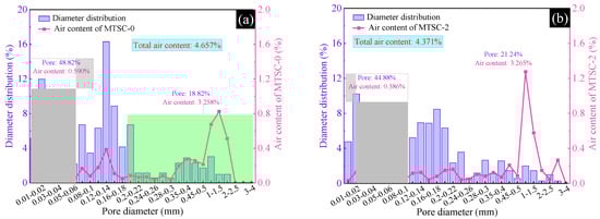 The air void diameter distribution and air content of the hardened MTSC are shown in Figure 8. Existing studies show that the reduction in pores with a diameter less than 0.1 mm and the increase in pores with a diameter more than 0.2 mm would reduce the strength of the concrete [30,31]. As shown in Figure 8a–g, with the increase in MTS dosing, the pores with a diameter less than 0.1 mm in MTSC gradually decrease, while the pores with a diameter more than 0.2 mm gradually increase. Specifically, with the increase in MTS content from 0% to 100%, the number of pores with a diameter less than 0.1 mm in hardened MTSC decreases from 48.82% to 19.06%, and the reduction rate is 61.0%. The quantity of pores with a diameter greater than 0.2 mm increases from 18.82% to 69.66%, and the rate of increase is 270.1%. The main reason is that, on the one hand, the content of fine powder (particle size < 0.15 mm) in MTS is high, and the fine powder plays a filling role in MTSC, which makes its structure more compact and reduces the small pores (diameter < 0.1 mm). However, the increase in MTS content can lead to the reduction in the content of sand with a particle size of 0.15~0.3 mm, so the large pores (diameter > 0.2 mm) in MTSC increase. On the other hand, MTS contains a small amount of gypsum, which can react with cement to form ettringite, thus effectively filling the pores of the concrete. However, with excess MTS, the large amount of ettringite produced by the reaction can generate swelling stresses, which can destroy some of the small pores and interconnect to form large pores, resulting in more pores with a diameter of more than 0.2 mm in MTSC. It is noteworthy that compared with MTSC-0, the pores with a diameter less than 0.1 mm in the hardened MTSC are reduced by 7.30%, and the reduction rate is 15.0% when the amount of MTS does not exceed 40%. Additionally, the pores with a diameter larger than 0.2 mm increase by 9.79%, with an increase rate of 52.0%. Moreover, the distribution of pores in MTSC is more uniform with the incorporation of a moderate amount of MTS.