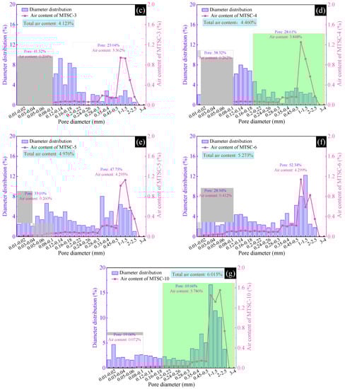 Pore diameter distribution and air content of MTSC. (a) MTSC-0, (b) MTSC-2, (c) MTSC-3, (d) MTSC-4, (e) MTSC-5, (f) MTSC-6, (g) MTSC-10.