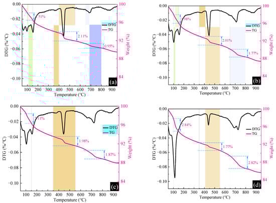 Figure 9 shows the TG/DTG curves of MTSC-0, MTSC-3, MTSC-4 and MTSC-10. Previous studies showed that the TG/DTG curves of cement hydration specimens are mainly divided into two stages [32,33]. In the first stage, C-S-H, ettringite, AFm and other hydration products lose water and decompose at 30~300 °C. Portlandite (350~550 °C) and carbonate (650~800 °C) decompose in the second stage. The following analysis was carried out by combining the existing studies and the characteristics of MTS. At 100~150 °C, all samples of MTSC primarily undergo decomposition of ettringite [34]. Specifically, the mass losses of ettringite in MTSC-0, MTSC-3, MTSC-4 and MTSC-10 are 1.51, 1.98, 2.11 and 2.84%, respectively. This fully indicates that the gypsum in MTS and cement jointly undergo hydration reactions to produce ettringite. With the increase in MTS content, the ettringite generated in MTSC also increases gradually. At 350~550 °C, all samples mainly experience the decomposition of portlandite [35,36]. It is obvious from Figure 9a–d that the mass loss of portlandite in the samples is in the following order: MTSC-0 > MTSC-3 > MTSC-4 > MTSC-10. The portlandite is mainly generated by the hydrolysis of C3S and C2S in the cement clinker. However, with the incorporation of MTS, the weak acidity of MTS leads to a sequential decrease in the content of portlandite in MTSC. The sample’s main carbonate decomposition occurs at 650~800 °C [37,38]. It can be seen that the mass loss of carbonate in MTSC gradually increases with the increase in MTS content. This is mainly because, on the one hand, the increase in MTS leads to an excess of gypsum, and part of gypsum does not participate in the reaction. Moreover, the MTS contains other carbonate substances. On the other hand, maybe the irregular operation that occurred during the test process caused the carbonation reaction of MTSC.