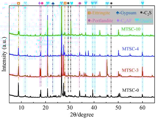 The XRD patterns of MTSC-0, MTSC-3, MTSC-4 and MTSC-10 are shown in Figure 10. The main phases of MTSC are quartz, ettringite, portlandite and unreacted cement clinker (C4AF and C2S). Compared to the concrete without MTS, the incorporation of MTS increases the peak strength of ettringite and decreases the peak strength of portlandite. The results are consistent with the results of TG/DTG curves. It is noteworthy that the gypsum appears in MTSC-10, which indicates that the partial gypsum does not participate in the cement hydration reaction when all RS is replaced by MTS.