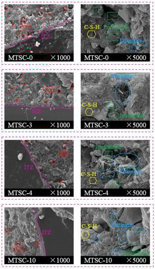 The SEM images of MTSC-0, MTSC-3, MTSC-4 and MTSC-10 are shown in Figure 11. In general, the microstructure of the MTSC is relatively dense. The interfacial transition zones (ITZ), pores, needle-like ettringites, flaked portlandites and C-S-H gels of MTSC can be clearly seen in Figure 11. Specifically, with the increase in MTS content, the SEM images of MTSC show less and less microporosity, which is consistent with the results in Figure 8. MTSC-3 and MTSC-4 produce a large amount of needle-like ettringite compared to MTSC-0. With the increase in needle-like ettringite, the increased ettringite fills the internal voids of the MTSC and makes its structure more compact, which is beneficial to the development of the strength of MTSC. Unlike the needle-like ettringite in MTSC-3 and MTSC-4, the ettringite in MTSC-10 shows a short rod-like uniform distribution. This is mainly due to the interaction between the increased ettringite and the joint extrusion, which causes the morphological transformation of ettringite. Simultaneously, a large amount of ettringite continues to react to generate AFm after cement setting, and it can generate large volume expansion stress, resulting in micro cracks in MTSC microstructure and reducing the mechanical properties of MTSC.