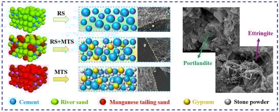 The abovementioned studies showed that compared to RS, MTS contains gypsum, which can react with C3A in cement by hydration to form ettringite. However, when the content of MTS is low, the ettringite generated by the reaction between gypsum and C3A fills the voids of MTSC, which makes its structure dense and enhances the mechanical properties of MTSC, while when the content of manganese tailing sand is high, the reaction generates too much ettringite produces expansion stress, which leads to the strength of MTSC decreasing. Therefore, the preparation of MTSC by replacing RS with an appropriate amount of MTS not only does not reduce the strength of concrete but even improves it. Additionally, the excessive amount of MTS is not suitable to replace RS for preparing concrete.
