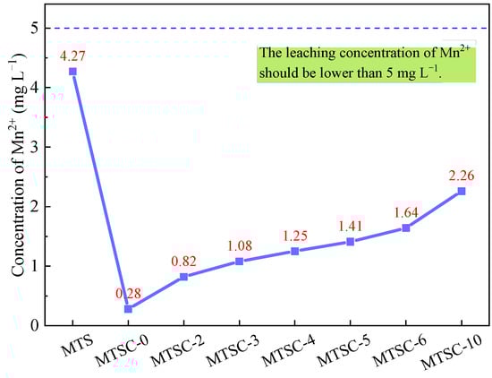 The chemical compositions of MTS (Table 2) indicate that the MnO content in MTS is relatively high. Therefore, there may be a potential risk of manganese leaching in the preparation of concrete from MTS, which may endanger human health and pollute the environment. Studies showed that cement-based materials are capable of solidifying heavy metals [42,43]. Figure 13 displays the leaching concentration of Mn2+ in MTS and MTSC. It can be seen that the leaching concentration of Mn2+ in MTS is 4.27 mg L−1, which meets the requirement of Mn2+ concentration of less than 5 mg L−1 in the National Standard of the People’s Republic of China: Sewage Discharge Standard (GB/T 8978-1996) [44]. Therefore, the leaching concentration of Mn2+ in MTSC prepared by using MTS also meets the requirements. This is consistent with the results in Figure 13. It is worth noting that, compared to MTS, the leaching concentration of Mn2+ in MTSC is significantly lower. This is primarily because cement hydration creates an alkaline environment for Mn2+ solidification, allowing Mn2+ to be converted into stable MnO(OH)2 precipitation. Moreover, Mn2+ may replace part of Al3+ in the C-S-H gel during cement hydration to form a stable structure, thus reducing the leaching of Mn2+. In addition, the dense structure of MTSC also prevents the leaching of Mn2+, making the leaching concentration of Mn2+ in MTSC dramatically lower than that in MTS. Therefore, the use of MTS for concrete preparation can realize the clean treatment of MTS and reduce the risk of environmental pollution from MTS.