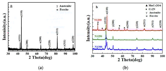 XRD patterns of the as-received stainless steel powder and the prepared porous high-nitrogen stainless steel are shown in Figure 2. The XRD pattern of as-received powder is presented in Figure 2a, which confirms that the powder consisted of ferrite and a slight amount of austenite.