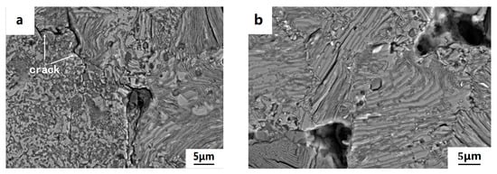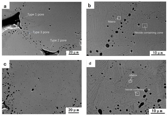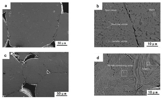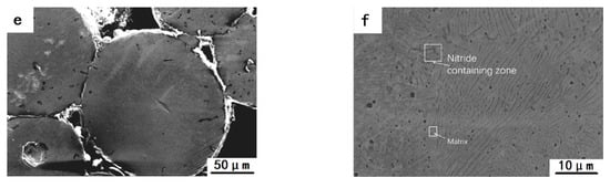 Based on the XRD results from the N1200 sample (Figure 2b), its main composition was ferrite with a little amount of austenite, and the nitrogen content was higher after nitriding compared to the as-received powder. A small amount of ferrite transformed to austenite. Nitride precipitation occurred because of excess nitrogen beyond solid solubility, but the nitride concentration was low and thus did not show a peak in the XRD pattern (Figure 2b). The boundaries of particles were noticeable (Figure 3a), indicating that the incomplete sintering is not related to the good metallurgical bonding between particles. According to the XRD pattern in Figure 2, the N1250 sample was mainly composed of austenite with a small amount of ferrite. The SEM micrographs of N1250 sample (Figure 3c,d) demonstrate that the metallurgical bonding between particles is achieved. Lamellar precipitation was the only precipitated nitride detectable at high magnification. Compared to the N1200 sample, the N1300 sample sintered better, and most of the particle boundaries disappeared. Moreover, the precipitates are mainly lamellar. The nitrogen contents of N1250 and N1300 were much higher than that of the as-received powder. The EDS results are shown in Table 3. As the sintering temperature rises, the samples tend to absorb more N under the N2 atmosphere, which leads to the increased N content and results in complicated nitrides. The matrix was austenite for the most part, which was conductive to the absorption of nitrogen at the sintering temperature of 1250 °C. Nitrogen content of the sample decreased slightly when the temperature was raised from 1250 °C to 1300 °C.