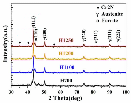 The XRD pattern of hydrogen reduced samples of porous duplex stainless steel is shown in Figure 4. All four groups of samples showed the dual-phase of austenite and a small amount of ferrite, accompanied by little nitride precipitation.