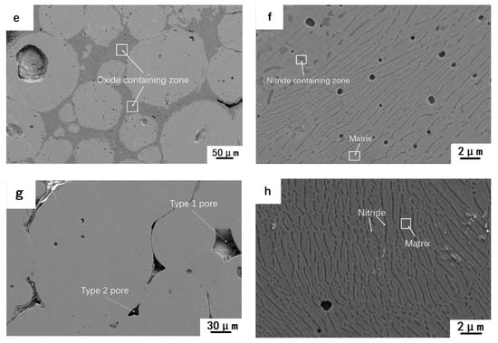 The sintering of sample H1250 was favorable and its overall oxygen content was less than that of sample H1200. The precipitates were fine and evenly distributed (Figure 5h), the interval of lamellar space was less than 1 mm. Three types of pores exist in the samples reduced by hydrogen. Type 1 pores left by pore-forming agents with the size of 50–300 μm; type 2 pores produced by gap between particles with the size of 10–50 μm; type 3 pores left by oxide reduction with the size less than 1 μm, are mostly distributed at the junctions of the particles. Type 2 and type 3 pores with large sizes are conductive to complete the reduction. The pores can provide access for reducing gas H2 which can come into contact with the stainless steel particles and promote the diffusion out of the locally generated gaseous products. Meanwhile, the existence of pores also provide access for N2 to accelerate the gas–solid nitridation.