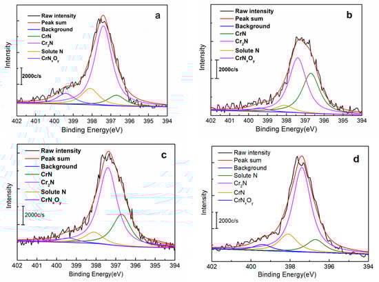 XPS peak convolution of CrN, Cr2N and solute N in the as-fabricated porous samples: (a) N1250; (b) H700; (c) H1100; (d) H1250.