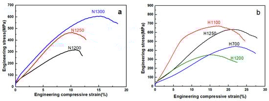 Engineering compressive stress–strain curve of the as-fabricated porous HNASS samples. (a) unreduced samples N1200, N1250 and N1300, (b) reduced samples H700, H1100, H1200 and H1250.
