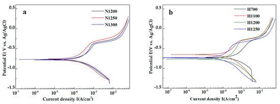 Potentiodynamic polarization curves of the as-fabricated porous samples in 0.9 wt.% NaCl solution. (a) unreduced samples N1200, N1250 and N1300, (b) reduced samples H700, H1100, H1200 and H1250.