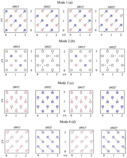 An excitation of these three-dimensional DNVMs occurs by providing the initial atomic displacements according to the patterns. Atomic planes designated as (001)β², (002)β², (001)β³, and (002)β³ represent four adjacent (001) planes parallel to the (x,y) plane and are visualized in Figure 1. Black arrows depict the displacement components βx and βy, which are in the plane of the figure. Red dots (directed into the top of the atomic plane) and blue crosses (directed into the depth of the plane) indicate the displacement component βz. For one-component DNVMs, all non-zero displacement components are of the same magnitude. DNVM 2 contains atoms with zero initial displacements, while DNVMs 1, 5, and 6 do not. For clarity, the presented schemes of atomic displacements for one-component DNVMs display only the parts of the three-dimensional computational cells.