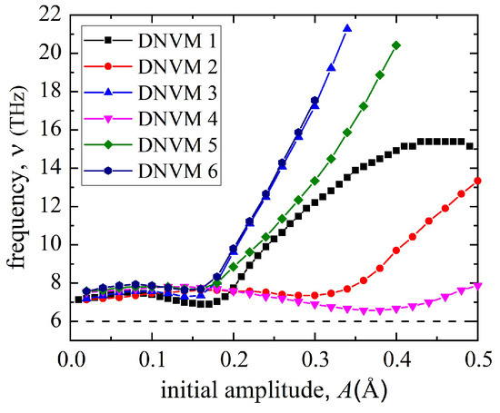 , frequency of atomic oscillations almost does not change and does not demonstrate a linear increase. Note that all DNVM frequencies are outside the phonon spectrum, which is approximately 6 THz for the used interatomic potential [39].