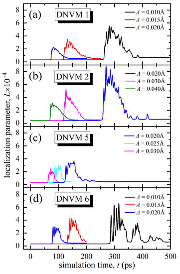 is the longest lived, with the lifetime of 280 ps. After this point, an abrupt increase in the localization parameter takes place, which corresponds to the localization of energy. This ends at a time of approximately 350 ps. Unlike other modes, DNVM 6 has several regions of energy localization, which are clearly visible in Figure 3d. Thus, the first region begins after the modulational instability at 280 ps and lasts up to 350 ps. Then, there is a short time interval in which the localization parameter remains small. The second region starts at the time of 360 ps and ends at about 400 ps. As can be seen in Figure 3d, there are two other small increases in the localization parameter, which corresponds to only a slight localization of energy on individual atoms. The maximum value of the localization parameter is approximately equal to 0.0006, which is somewhat higher than that for DNVM 1 at the same initial amplitude.
