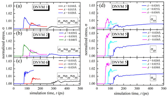 The normalized stresses , , and as functions of the simulation time calculated for four one-component DNVMs at different initial amplitudes, A, shown in legends. For DNVMs 1, 2, and 5, the equality holds, while for DNVM 6.
