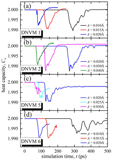 It is clearly seen that the heat capacity calculated by Formula (3) for all investigated DNVMs remains constant before the development of modulation instability (in this case equal to two). When energy is localized on chaotic DBs, the heat capacity of the system decreases. Further, after the attenuation of these DBs, the values of heat capacity practically return to the initial value (see Figure 5). For all four DNVMs, decrease in heat capacity at the studied amplitudes occurs in the range of 0.5β1.5%. The minimum change in heat capacity is observed for DNVM 5 at the initial amplitude of 0.03 Γ