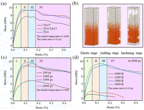 - The tensile process in TC4-TA17 simulation is similar to those of macroscopic materials, involving elastic deformation and a plastic deformation stage, and showing a necking phenomenon. When the system enters plastic deformation, the stress–strain curve shows a spike, and high yield strength is acquired.