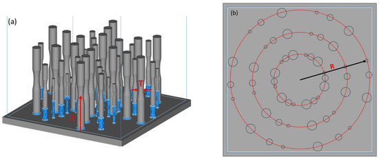 Build design for the preliminary investigation. (a) Oblique view of the build design for the as-built fatigue study. Only one height (H) level was printed for this preliminary investigation. Thickness (T) of the parts is the diameter of the thinnest part of the gauge section. (b) Top view of the build with red rings indicating the three levels of radial distance (R).