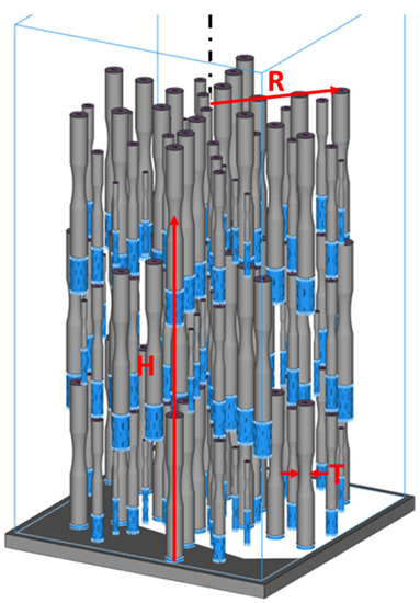 Oblique view of the build for fatigue specimens of the full factorial DOE. Illustrated with the red arrows are the three design parameters—Height (H): distance from the base plate to centroid of a part; Radial distance (R): distance from the middle of the build plane (central axis represented by dashed black line) to centroid of a part; and Thickness (T): diameter of the thinnest portion of the gauge section of a part.