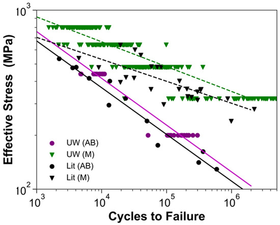 For comparison of results with the literature, the maximum stress was converted to an effective stress, as described by Li et al. [4], to correct data from studies that did not test at a stress ratio of 0.1. Converting to the effective stress with Equation (2) has been shown to be acceptable for −0.5 < R < 0.5 [4].