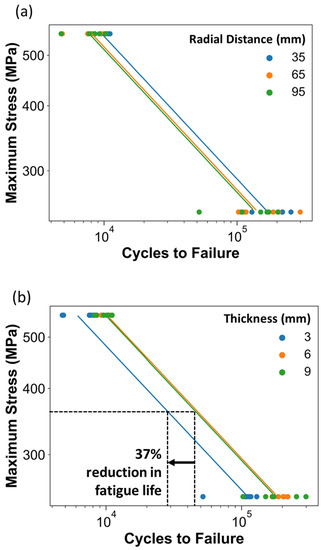 Further scrutiny of the stress–life data according to the factor levels enables an assessment of the main effects. The fatigue data are presented with respect to the three levels of radial distance and thickness in Figure 4. Apparent from the distribution, there is a reduction in the fatigue life of the metal with an increasing radial distance from the center of the build plate (Figure 4a) and a substantial reduction (nearly 40%) in the fatigue life with a reduction in thickness from 9 to 3 mm.